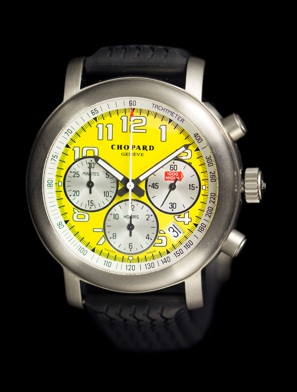 number 92 in a limited edition of 500, 40.00 mm case diameter, yellow dial signed CHOPARD, luminous Arabic numerals with outer chapter ring calibrated to 60 units, luminous pencil hands with center red arrow hand for chronograph seconds, date aperture at 4:30, subdials at 3, 6 and 9 o'clock for seconds, chronograph hours and chronograph minutes respectively, brushed circular case, coin edge crown and round chronograph pushers in the outer band, case back with center sapphire exposition crystal affixed with eight screws, Cal. 2894-2 self-winding 37 jewel rhodium plated movement adjusted to four positions with fausses ctes finish, rhodium plated rotor with fausses ctes finish signed Chopard, rubber strap with racing tire tread pattern, titanium buckle.