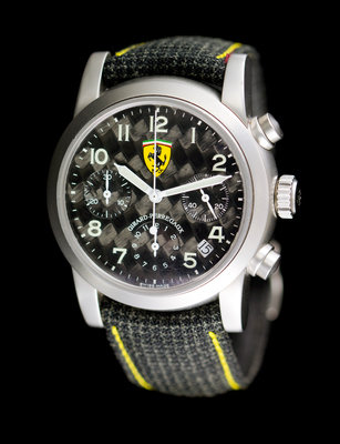 37.00 mm case diameter, carbon fiber dial with Ferrari logo signed GIRARD-PERREGAUX, luminous Arabic numerals, luminous sword hands with center hand for chronograph seconds, date aperture between 4 and 5 o'clock, circular brushed titanium case, Ferrari logo crown, case back affixed with eight screws, Cal. 2280 self-winding 57 jewel rhodium plated movement, black and yellow fabric strap, titanium buckle with Ferrari logo.