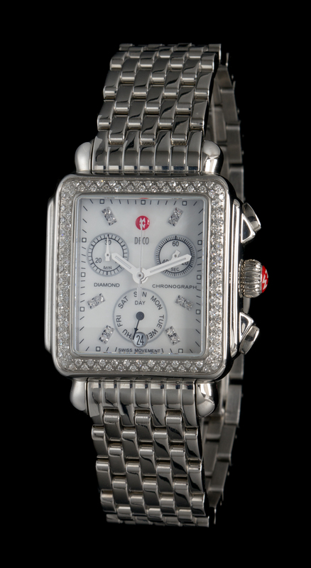 containing 120 round single cut diamonds weighing approximately 0.66 carat total, 34.00 x 33.00 mm case dimensions, mother-of-pearl dial with Michelle logo, applied silvered diamond baton numerals, luminous silvered pencil hands with center chronograph seconds hand, subdial for date at 6 o'clock, subdials at 2, 6 and 10 o'clock for seconds, day, and minute counter respectively, case back affixed by four screws, quartz movement, polished steel brick link bracelet, double deployant clasp.