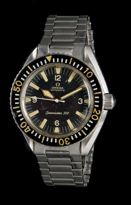 42.00 mm case diameter, matte black dial signed OMEGA, luminous baton and Arabic numerals, luminous steel sword hands with center sweep seconds hand, bidirectional turning bezel calibrated to 60 units, polished steel tonneau case, coin edge crown with embossed Omega logo, screw on case back, Cal. 550 self-winding 17 jewel movement signed OMEGA, link bracelet, deployant clasp signed OMEGA. Movement number: 27140656.