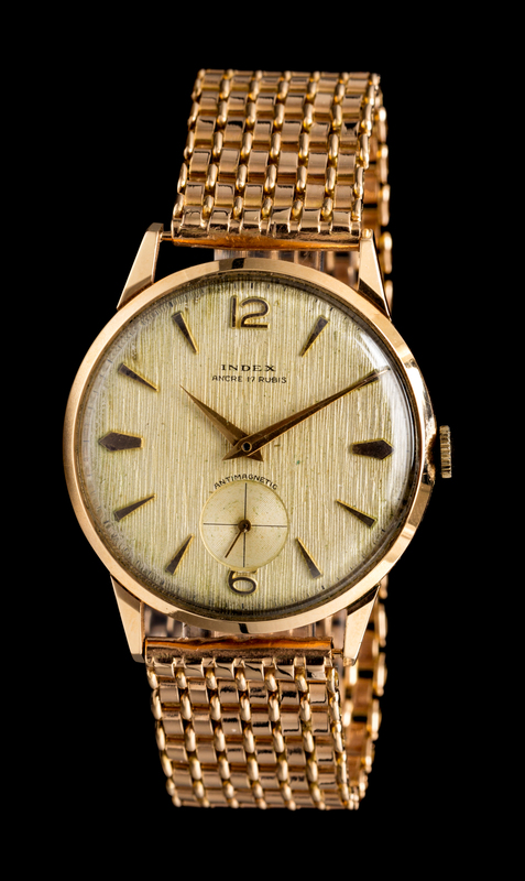 35.00 mm case diameter, textured champagne dial signed INDEX, applied gilt Arabic, lozenge and index numerals, gilt pitched dauphine hands, subdial for seconds at 6 o'clock, tapered lugs, snap on case back, Cal. 1130 manual wind 17 jewel movement, 18 karat rose gold link bracelet, fold over clasp.