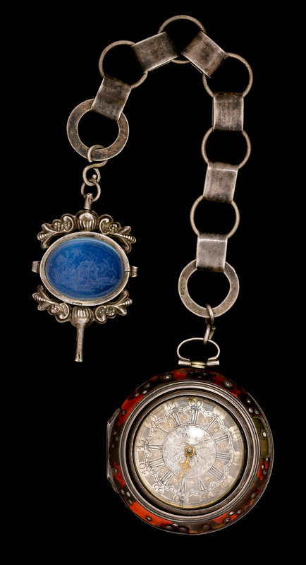 59.00 mm outer case diameter, intricate silver dial with gold accents, Roman chapter ring and outer register calibrated to 60 units signed TARTS, gilt Louis XIV hand (hour only), hinged swing out verge movement, three arm balance, pierced and engraved gilt balance cock, square baluster pillars, middle silver repousse case depicting a coronation scene within a scrollwork surround, outer case with faux tortoiseshell motif, circular and banded link chain with ornate terminal set with an oval etched glass pane.
