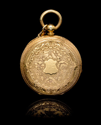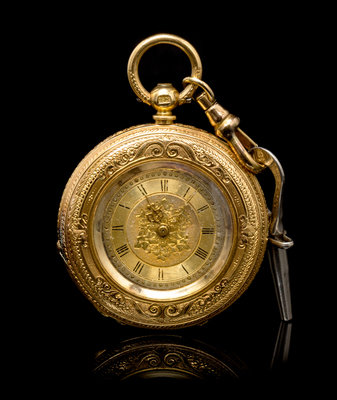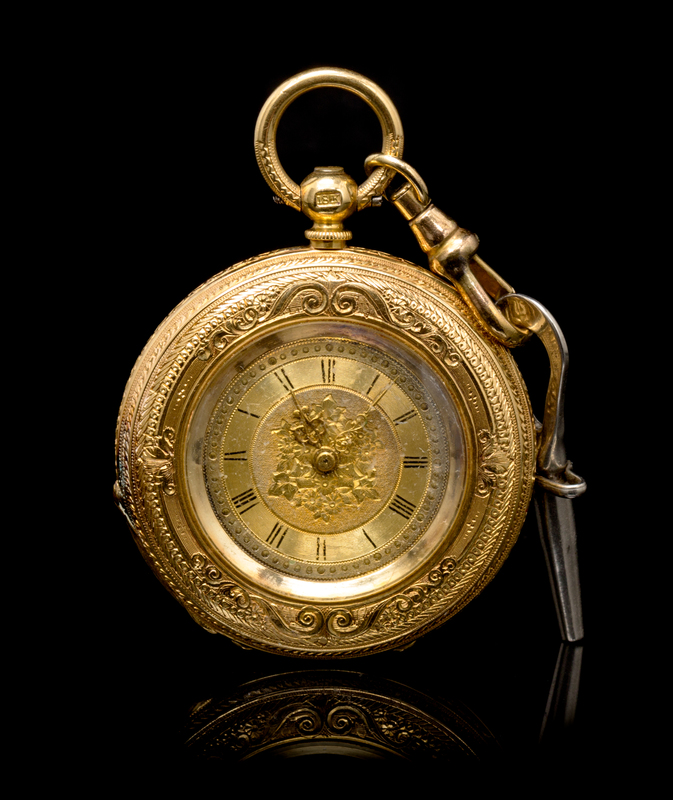 36.00 mm case diameter, alternating engraved and radial finished gold dial, Roman numerals, gold Louis XV hands, outer case intricately engraved with floral and foliate motif with blank cartouche, polished cuvette, key wound and set gilt movement.Accompanied by a key.