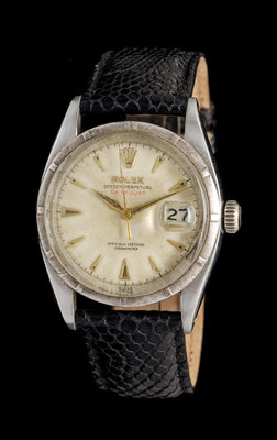 35.00 mm case diameter, matte silvered dial signed ROLEX, applied gilt dart numerals, gilt alpha hands with center sweep seconds hand, date aperture at 3 o'clock with magnifier window in crystal, graduated bezel, polished tonneau case, screw on case back, 18 jewel self-winding rhodium plated movement signed ROLEX, black lizard strap, silver tone tang buckle.