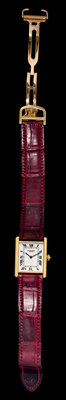 purchased in December of 2000, 29.00 x 23.00 mm case dimensions, white guilloche finish dial signed CARTIER, Roman numerals, blued steel sword hands, polished tank case, gnurled crown with cabochon sapphire, case back affixed with four screws in the outer band, Cal. 021 MC manual wind 17 jewel movement signed CARTIER, reddish brown crocodile strap signed CARTIER, 18 karat yellow gold deployant clasp signed CARTIER.Accompanied by outer box, inner case, leather folder, instruction booklet, and certificate of authenticity, all signed CARTIER.