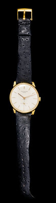 33.00 mm case diameter, matte silver dial signed PATEK PHILIPPE HAUSMANN & CO., applied gold baton numerals, gold pencil hands, subdial for seconds at 6 o'clock, polished bezel, embossed Calatrava symbol on crown, snap on case back, Cal. 10-200 manual wind 18 jewel movement adjusted to heat, cold, isochronism and five positions stamped with the Geneva seal and signed PATEK, PHILIPPE & Co., vintage black whale skin strap, 18 karat yellow gold Patek, Philippe & Co. tang buckle.Movement number: 790114.Case number: 429313.
