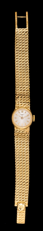 16.25 mm case diameter, white dial signed PATEK PHILIPPE, applied gold baton numerals, gold baton hands, polished bezel, circular case, coin edge crown with embossed Calatrava symbol, snap on case back, 18 jewel manual wind rhodium plated movement adjusted to heat, cold, isochronism and five positions with fausses ctes finish signed PATEK, PHILIPPE & Co., integrated textured link bracelet, textured box clasp with double P symbol.