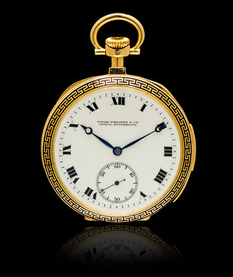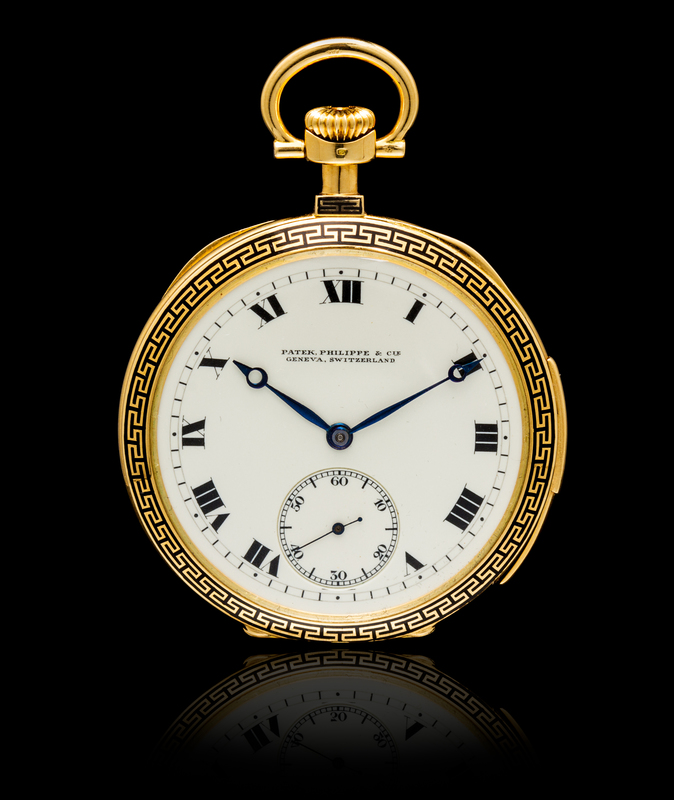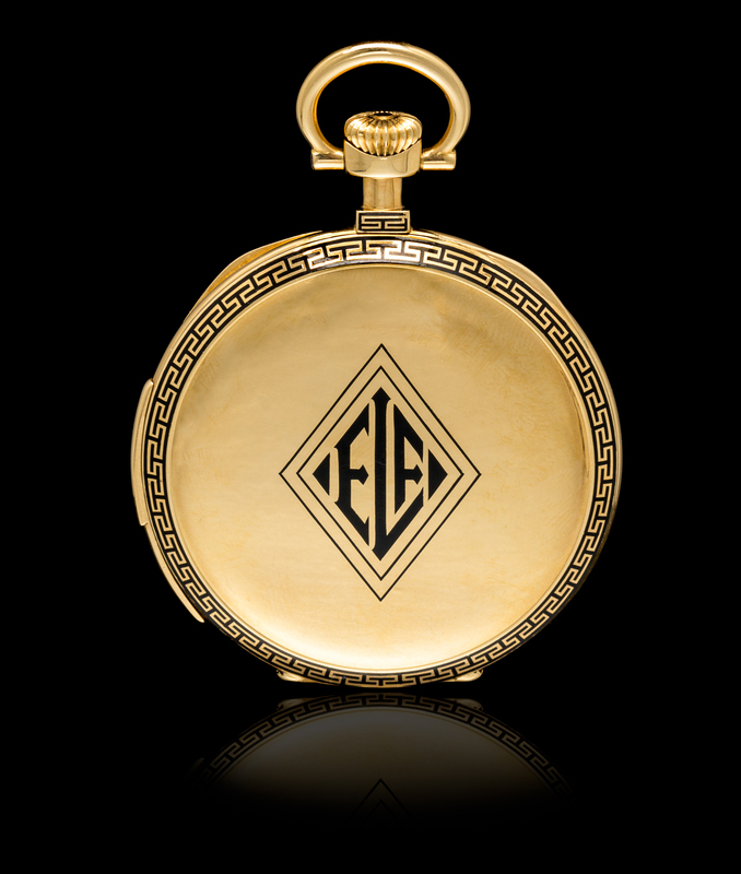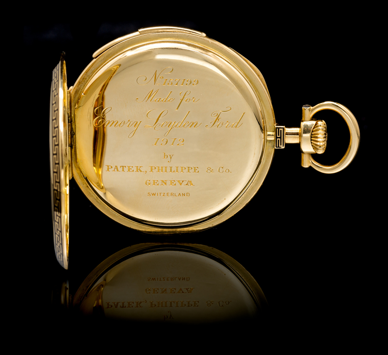 47.00 mm case diameter, white dial signed PATEK, PHILIPPE & CIE, painted Roman numerals, blued steel moon hands, subdial for seconds at 6 o'clock, bezel and case back outer edge accented with black enamel in a Greek key design, enameled monogram at center case back, solid cuvette, slide lever for repeater function on outer band, 23 jewel stem wound and set movement adjusted to eight positions with repeater function chiming hours, quarter hours and minute increments with fausses cotes finish signed PATEK, PHILIPPE & CO WRIGHT KAY & CO DETROIT.Movement number: 157199.Case number: 271379. Cuvette engraved: No.157199 Made for Emory Loydon Ford 1912 by PATEK PHILIPPE & Co. GENEVA SWITZERLAND.Accompanied by the original Certificate of Origin & Warranty, extra spring and original fitted case signed WRIGHT, KAY & CO DETROIT.