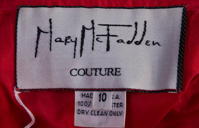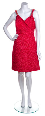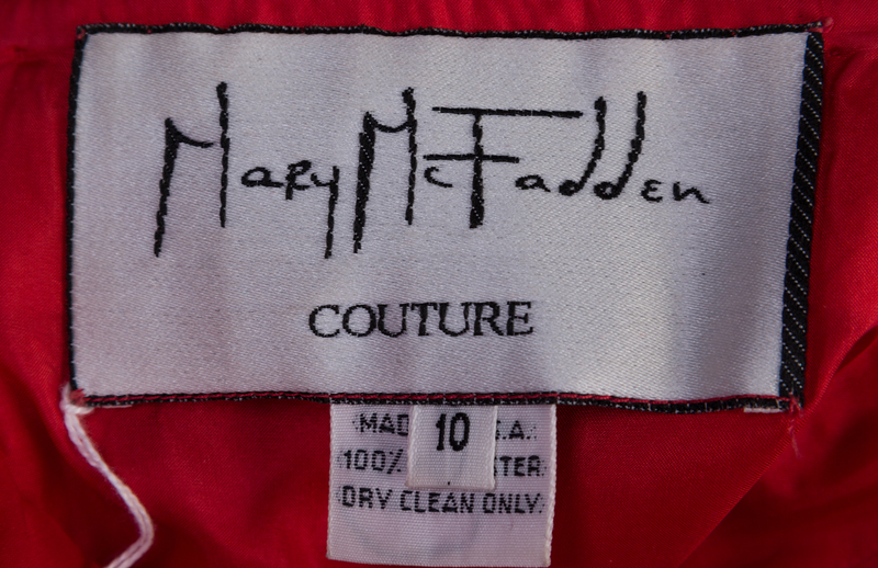 with a criss cross bodice, shoulder straps cinched with gold ribbon and a side zip closure.Labeled: Mary McFadden Couture.