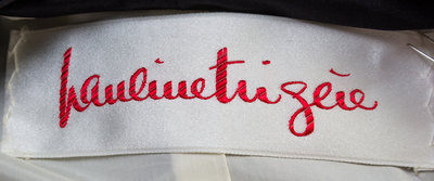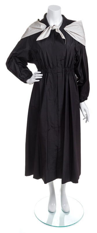 with long gathered sleeves, a detachable cream lined shawl, a gathered waist, front pockets and front snap closure.Labeled: Pauline Trigere.