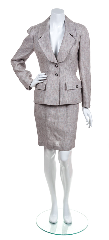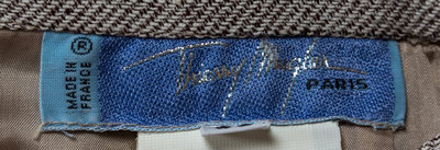 comprised of a long sleeve jacket with a notched collar, decorative silvertone geometric buttons and front flap pockets, together with a matching straight skirt with a back zip closure.Each labeled: Thierry Mugler.