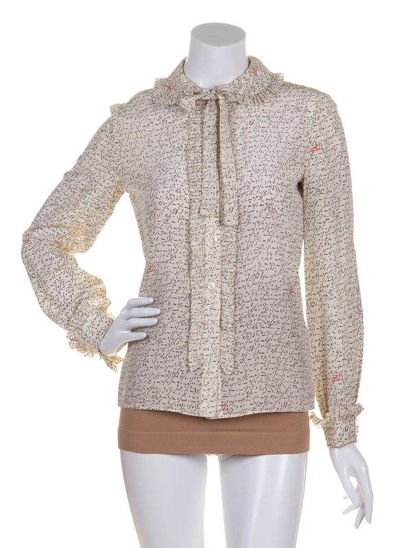 with long sleeves, decorative pleated trim, a detachable neck tie and front button closure.Unlabeled.