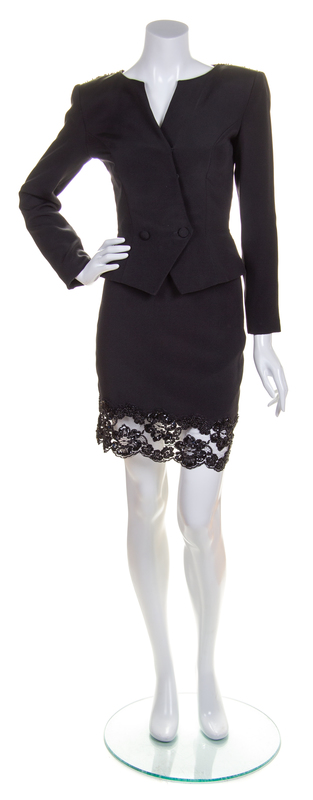 comprised of a jacket with sheer lace and sequin embroidered back detail, together with a matching straight skirt with a lace and sequin embroidered hem.Labeled: Vicky Tiel Couture.