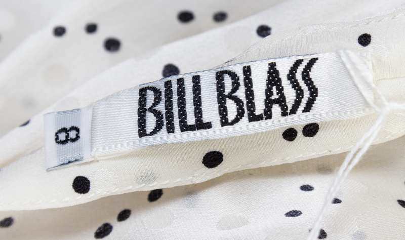 with short sleeves, pleating at the neckline, a gathered waist, ruffle detailing at the sides and hems and a back button closure.Labeled: Bill Blass.