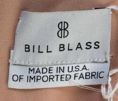 with a ruched bust and black ribbon accents.Labeled: Bill Blass.