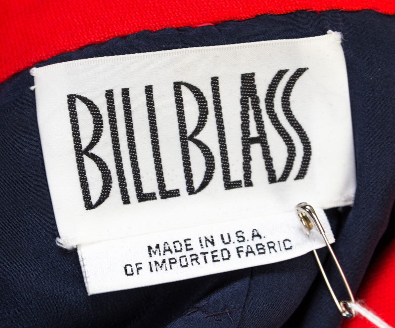 with a notched collar, red trim at the neckline, decorative silvertone button front closure and two flap pockets.Labeled: Bill Blass.