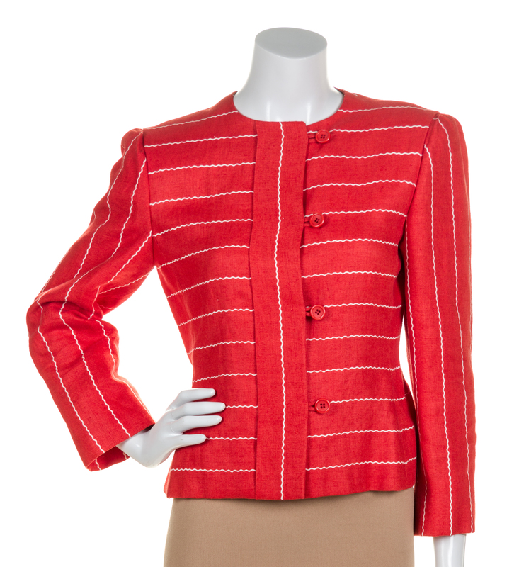 with long sleeves, a white zig zag motif and front button closure.Labeled: Bill Blass.