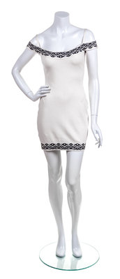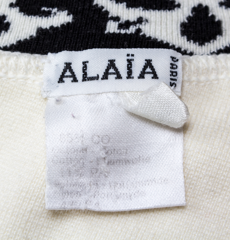 with a cold shoulder and black geometric trim. Labeled: Alaia.
