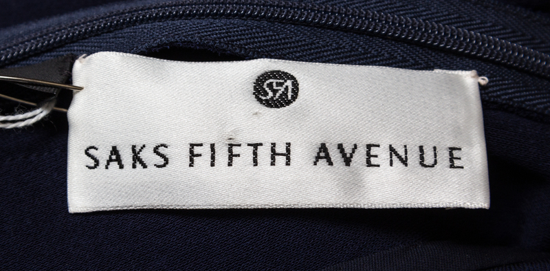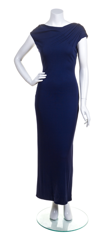 with pleat detail at the left shoulder and at the back left side, a low scoop back, a back slit and a side zip closure.Labeled: Silvertone "H" on black tape.