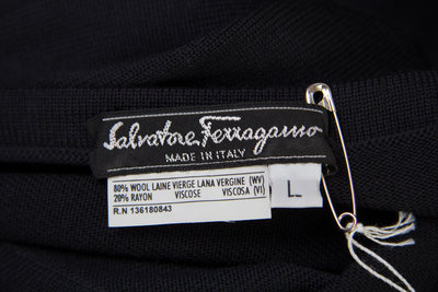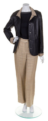 comprised of a black leather and taupe linen reversible coat, together with a taupe linen pant and black knit long sleeve top.Labeled: Salvatore Ferragamo.