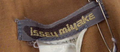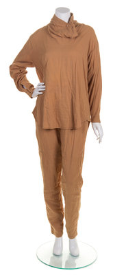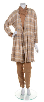 comprised of a taupe, cream, and grey plaid jacket, together with a taupe top and pant. Labeled: Issey Miyake.