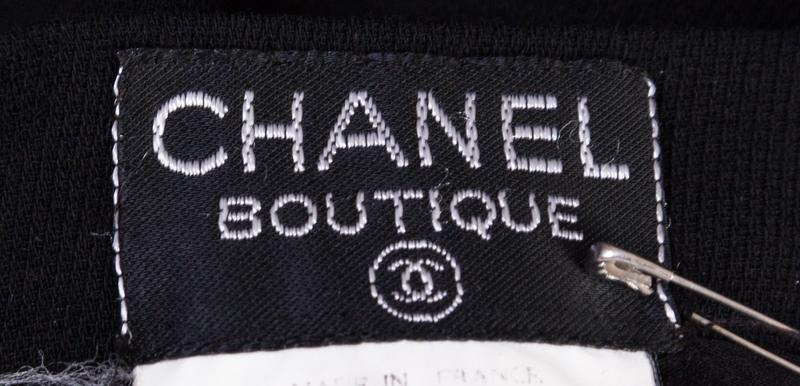 Fall/Winter 1995,comprised of a short sleeve peplum top with two front pockets, a split front hem, decorative black and goldtone buttons and a V-back with a decorative button closure, together with a matching straight skirt and belt with a chain link buckle.Each labeled: Chanel.