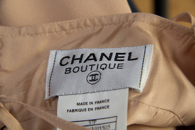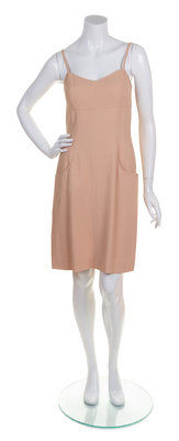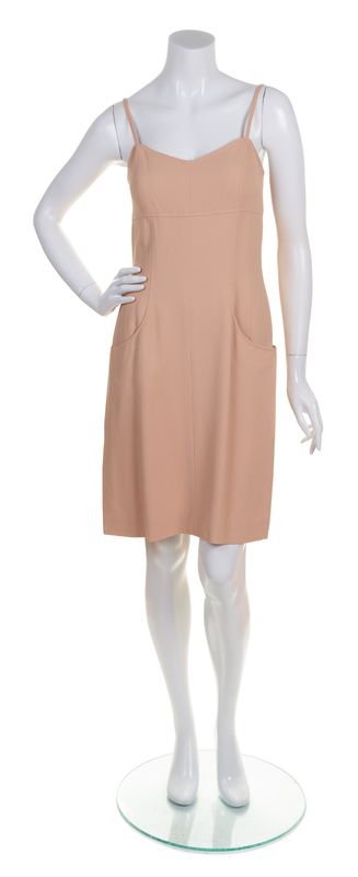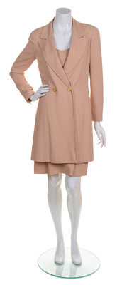 Spring 1997,comprised of a straight dress with spaghetti straps, two front pockets and a back zip and decorative goldtone button closure, together with a matching long sleeve double breasted coat.Each labeled: Chanel.