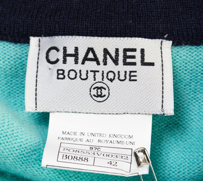 the first is turquoise with navy trim, two front pockets and logo button front closure (Cruise 1997); the second is a sea foam twin set with turquoise trim and four front pockets with logo button detail.Each labeled: Chanel.