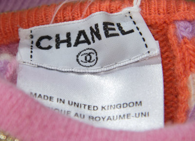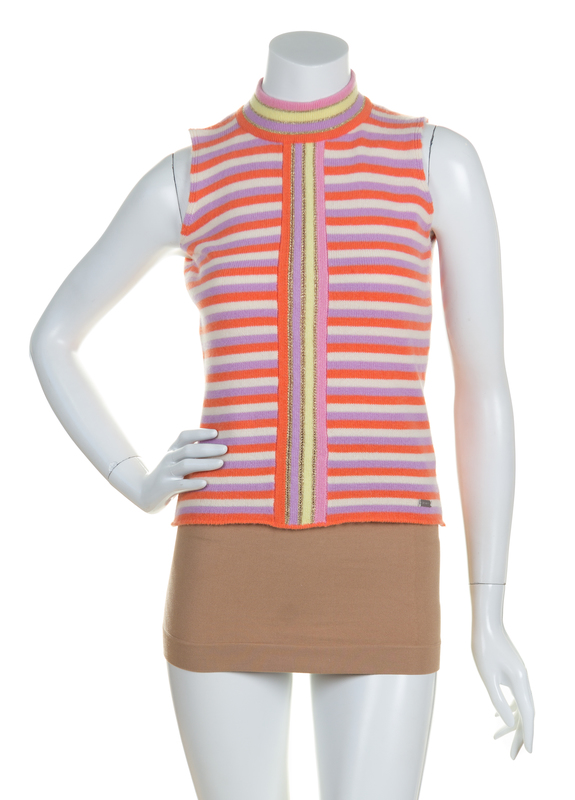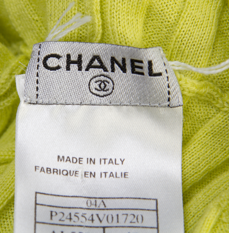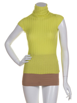 the first is sleeveless with gold metallic thread embellishment (Cruise 2001); the second is a chartreuse cap sleeve ribbed turtleneck (Fall 2004).Each labeled: Chanel.