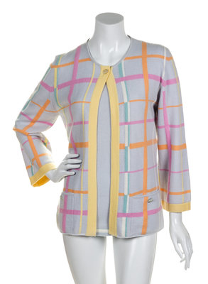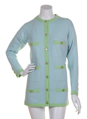 the first is sea foam with chartreuse trim, four front pockets, chartreuse and goldtone logo buttons together with a matching short sleeve shell; the second is pale blue with a multicolor plaid motif, mother of pearl top button closure, together with a matching sleeveless shell (1999 Cruise). Each labeled: Chanel.