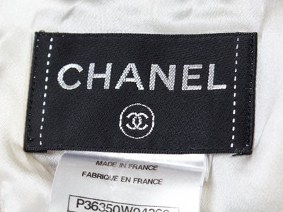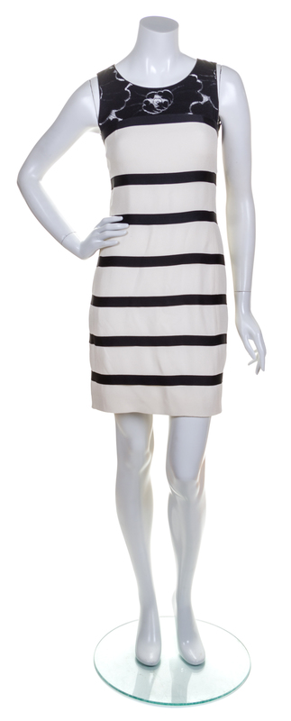 Spring 2010,with horizontal black fabric stripes, black camellia lace at the neckline and a back zip closure and a decorative logo button at the neck. Labeled: Chanel.