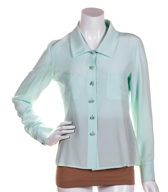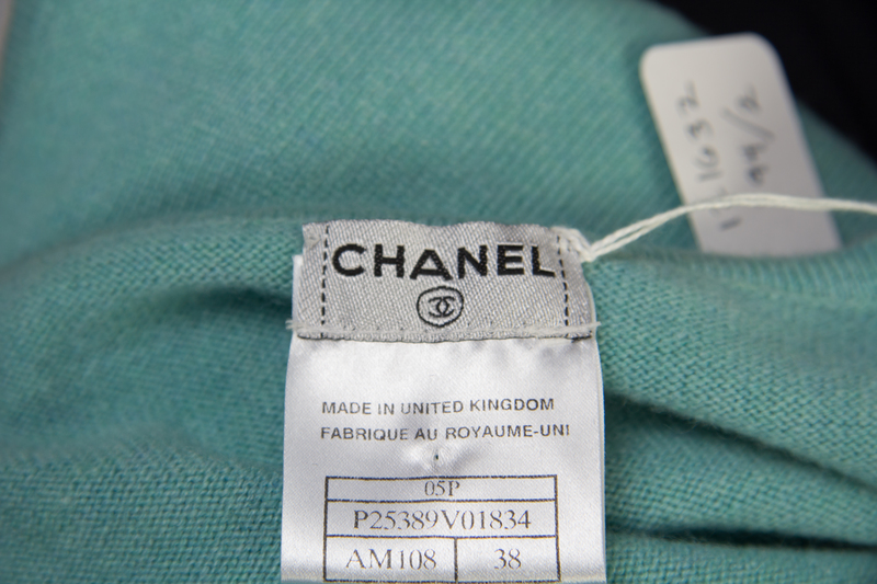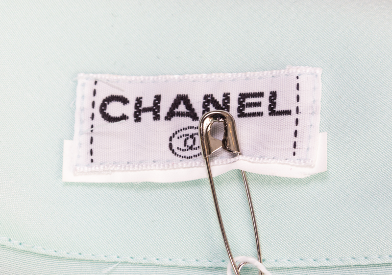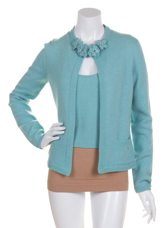 comprised of a cardigan with knit trim, seven removable embellished floral brooches and two front pockets, together with a matching sleeveless shell (Spring 2005) and a mint green silk long sleeve blouse with two front pockets and logo button front closure.Each labeled: Chanel.