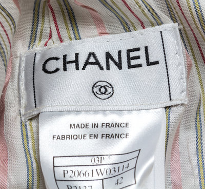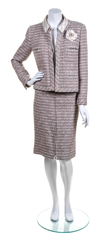 Spring 2003, comprised of a tweed jacket and matching skirt, together with a detachable pink, mint, and cream striped vest and a tweed camellia pin. Labeled: Chanel.