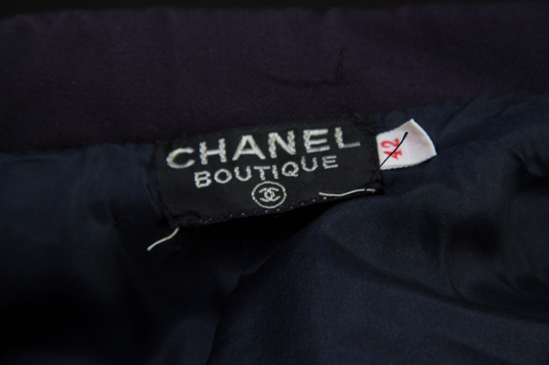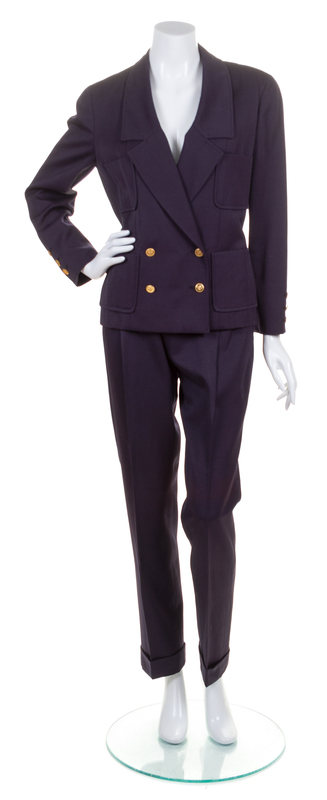 comprised of a double-breasted jacket with goldtone four leaf clover buttons and four patch pockets, together with a high-waist pleated pant.Labeled: Chanel.