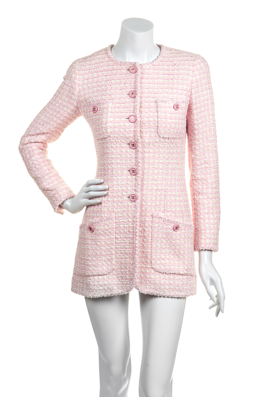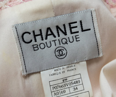 Spring 1997,with decorative pink logo buttons and four front pockets.Labeled: Chanel.