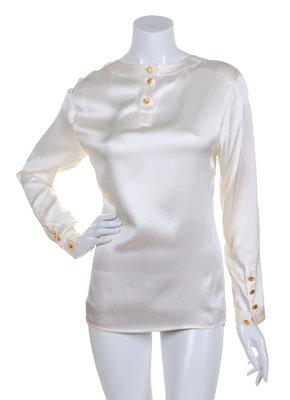 Spring 1998,comprised of a long sleeve jacket with a peter pan collar, decorative brushed silvertone buttons and two front flap pockets, together with a matching skirt with a side zip closure and a long sleeve cream silk blouse.Each labeled: Chanel.