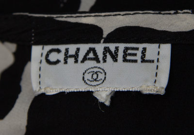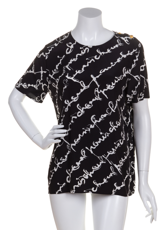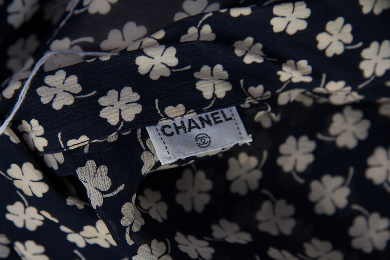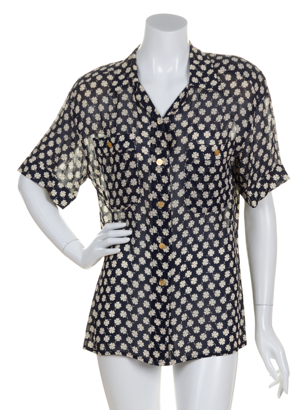 the first is navy with short sleeves, a clover motif, decorative goldtone logo buttons and two front pockets, together with a black and white short sleeve blouse with decorative goldtone buttons at the left shoulder.Each labeled: Chanel.