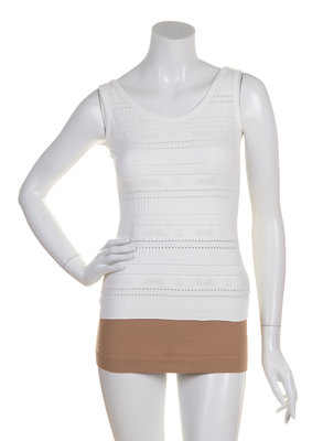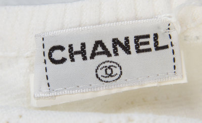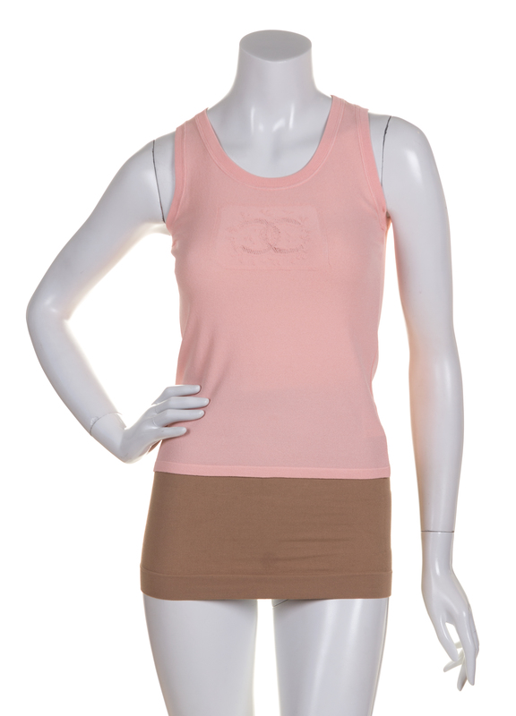 the first is white with a pointelle logo stitch pattern; the second is pink with a center embroidered logo.White top labeled: Chanel.Pink top attributed to: Chanel.
