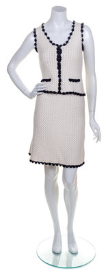 Spring 2003,comprised of a sleeveless top, together with a matching skirt with decorative navy pom pom trim.Labeled: Chanel.