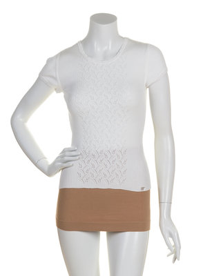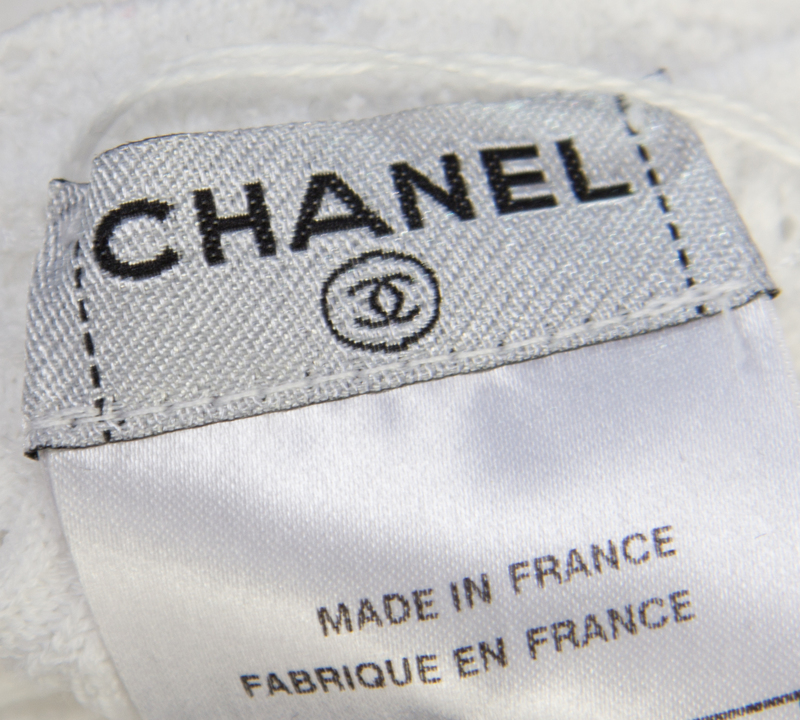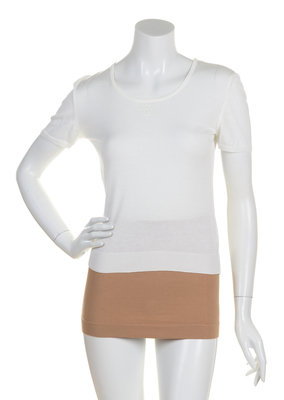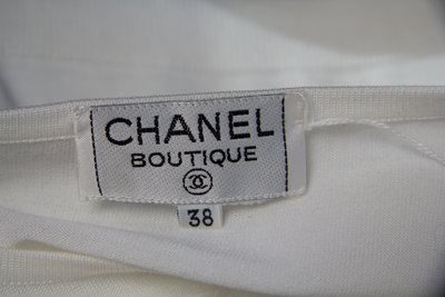 the first is ribbed with cap sleeves and decorative pointelle stitching (Spring 2005); the second with a scoop neck and a stitched center logo.Each labeled: Chanel.