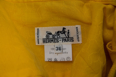 comprised of a reversible floral quilted/tan jacket with front button closure, a yellow short sleeve blouse, together with a matching wrap skirt.Jacket and blouse labeled: Hermes.