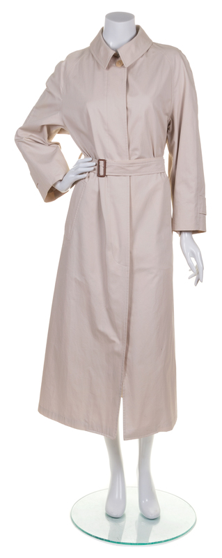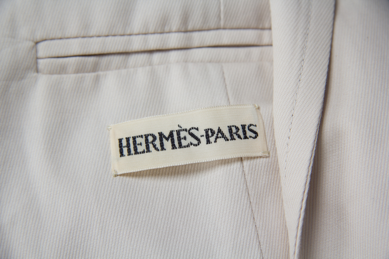 with two front pockets, decorative logo buttons, front button closure, a back slit with a button closure and a detachable matching belt.Labeled: Hermes.