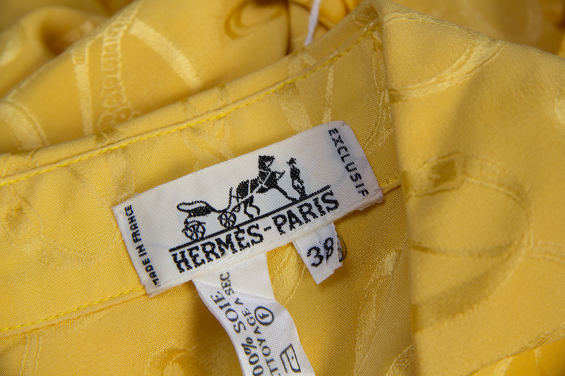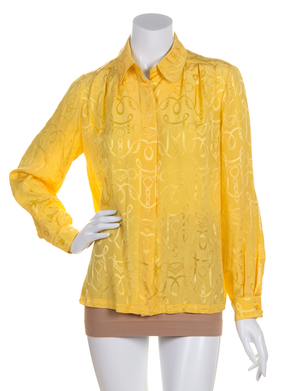 with long sleeves, a bridle and bit raised motif, front button closure and a detachable matching neck tie.Labeled: Hermes.