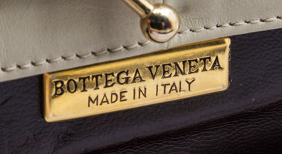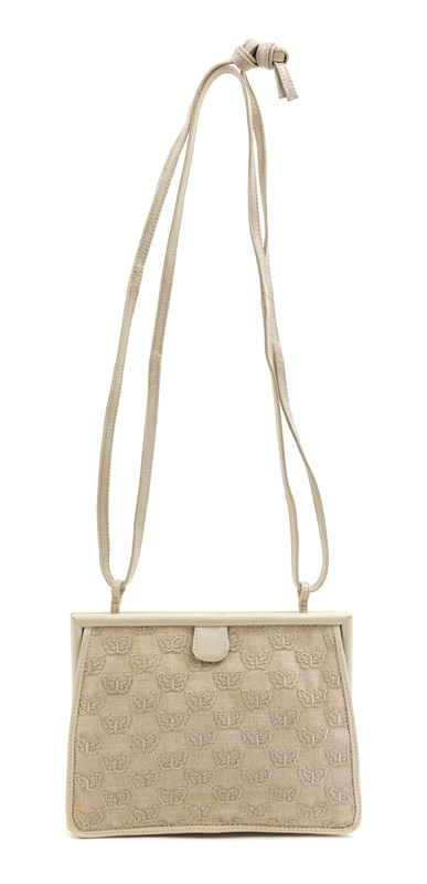 with leather trim and a removable shoulder strap to convert to a clutch, a canvas front and back with an embroidered butterfly motif and an interior kiss lock closure. Together with a dustbag.Stamped: Bottega Veneta.