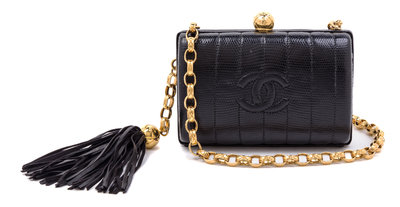 with a goldtone clasp closure at the top, a single chain link shoulder strap, a decorative chain and tassel, converts to a clutch and an interior slip pocket.Stamped: Chanel.