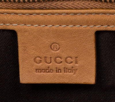 with brown leather trim, goldtone hardware, a front decorative leather logo, a top zip closure and an interior zip pocket.Stamped: Gucci.