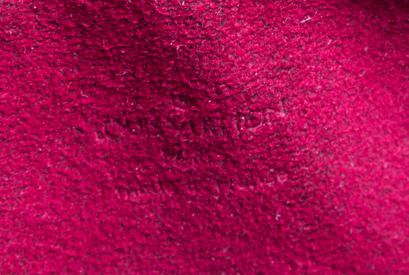 with goldtone hardware, brown leather trim and shoulder strap, a top zip closure, a front exterior zip pocket, decorative grommets and two interior slip pockets.Stamped on the hardware: Louis Vuitton.