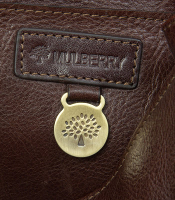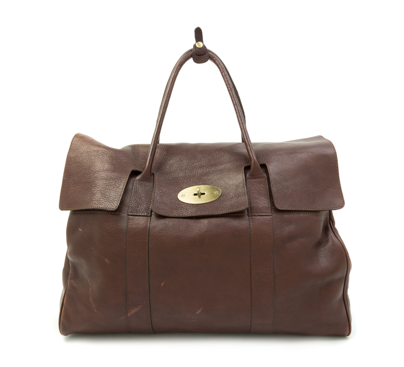 with a postman's lock, brushed leather interior, two interior slip pockets, one interior zip pocket, internal belt straps to enable widening for extra space and metal feet at the base.Stamped: Mulberry.