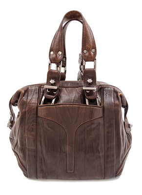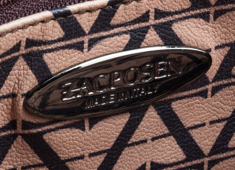 with silvertone hardware, double straps, pockets on both sides of the exterior, an interior zip pocket and two slip pockets.Stamped: Zac Posen.