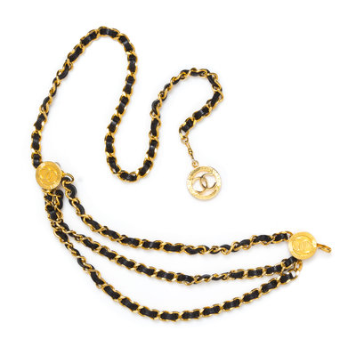 1984,with a triple strand leather and link chain at the front waist with decorative logo coins.Stamped: Chanel.